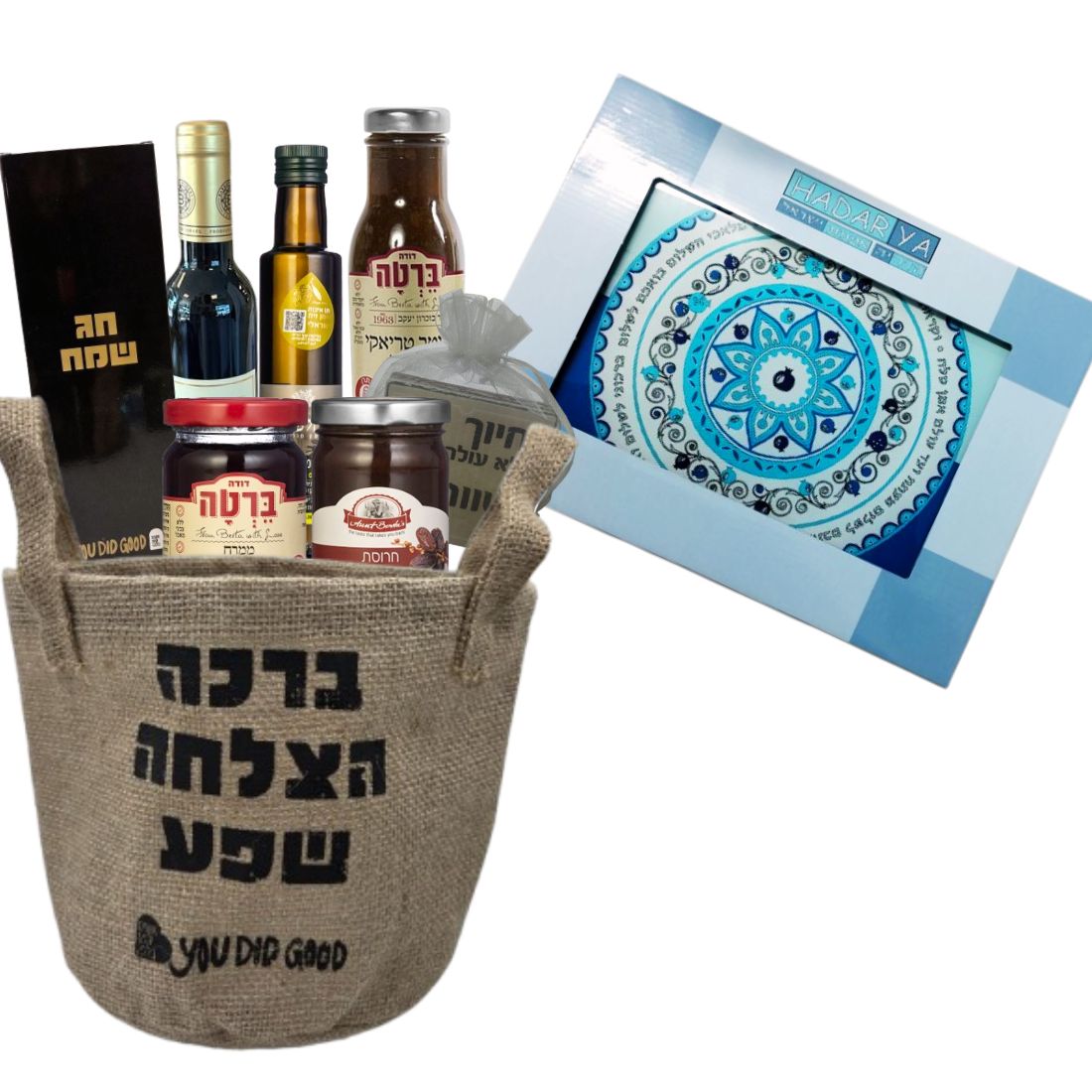 מארז דקל בסלסלה יין 375 מיל, שמן זית בוטיק 250 מיל, רוטב ברטה 330 מיל, מארז פרלינים, קונפיטורה 120 גרם, חרוסת 120 גרם, מארז 4 תחתיות לקפה. בתוספת קרש חיתוך/מגש מזכוכית מחסומת איכותית