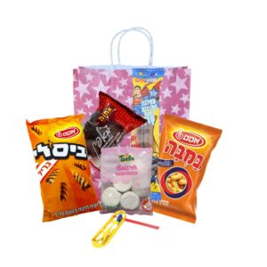 שקית צבעונית במילוי – 2 חטיפים מלוחים גדולים, מרשמלו ממולא, מאפינס, מקלות חמוצים.