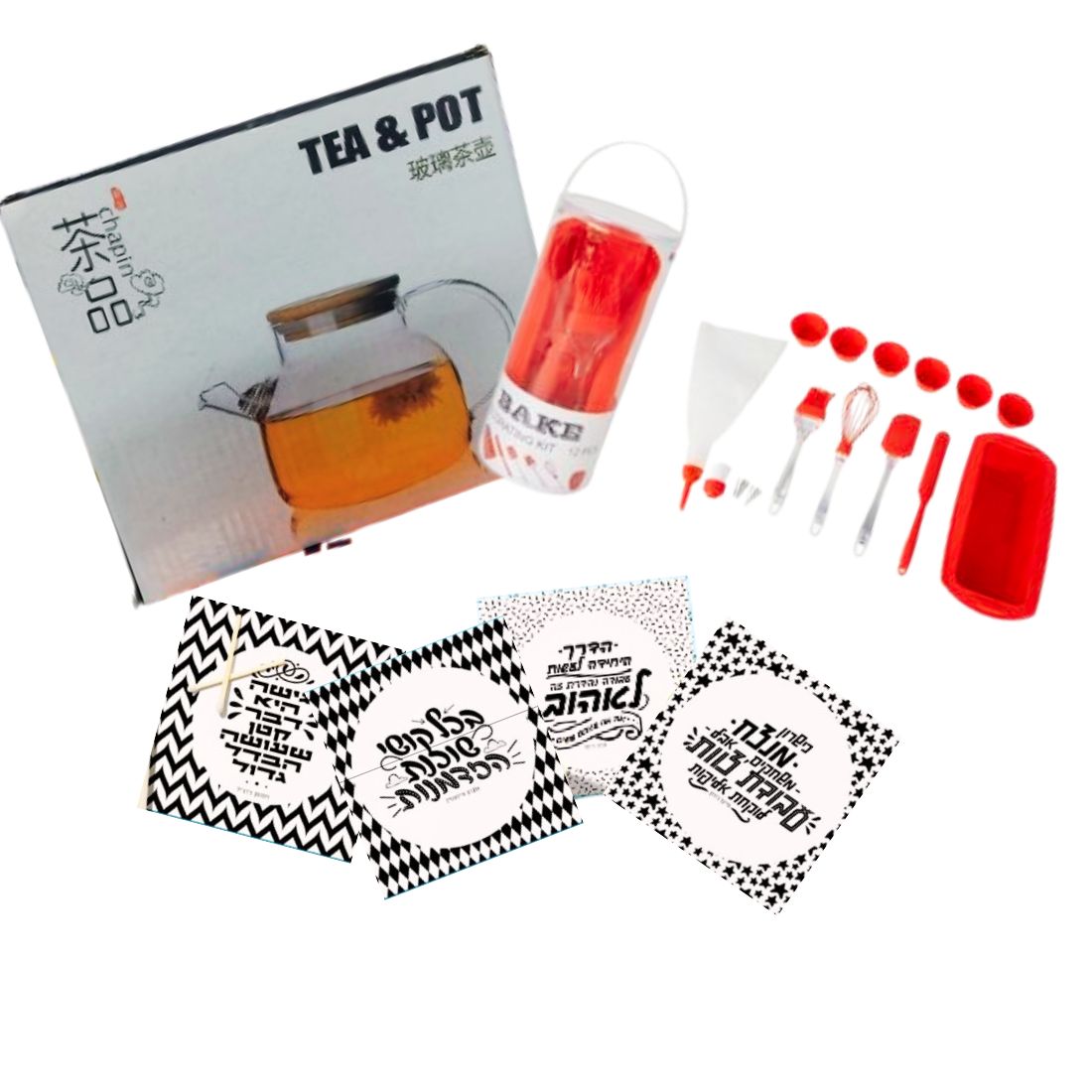 קנקן תה מזכוכית 1 ליטר בתוספת סט אפייה 11 חלקים ו-4 תחתיות לקפה/תה
