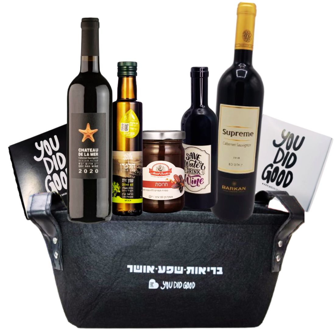 מארז איה בסל שחור- 2 יינות 750 מיל אדום ולבן, שמן זית בוטיק 250 מיל, מארז פותחנים בבקבוק, חרוסת 120 גרם ו-2 מארזי פרלינים איכותיים