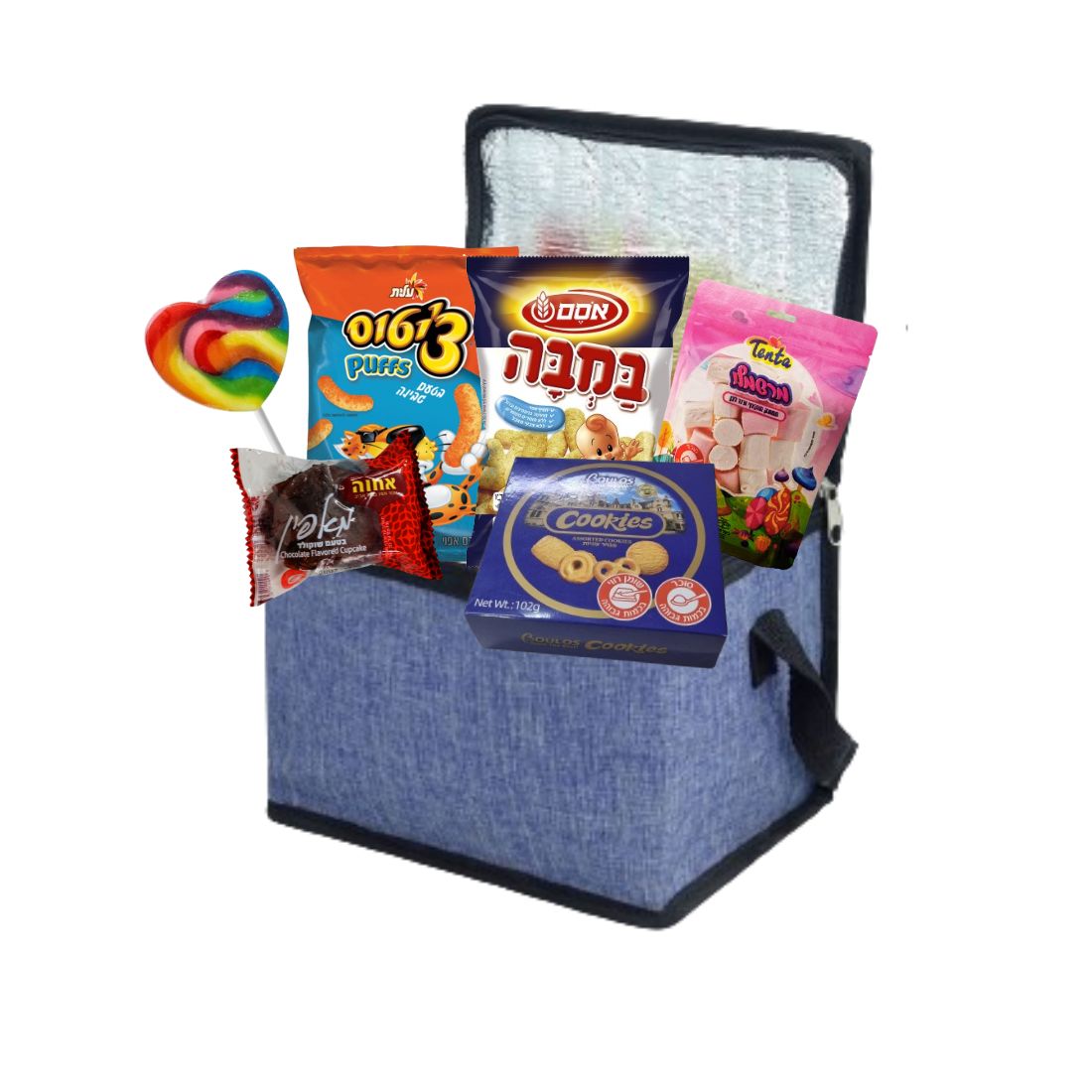 צידנית אישית 5.5 ליטר במילוי: 2 חטיפים מלוחים, מארז עוגיות חמאה, מאפינס, מרשמלו וסוכריה על מקל