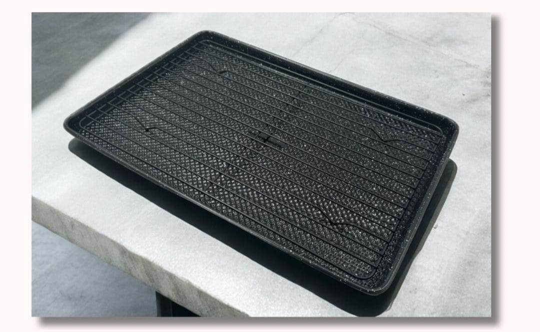 תבנית אלומיניום לתנור עם ציפוי אבן שיש ורשת מתכת גודל 39.5X27X2 עם ציפוי אבן שיש עמיד לפיזור חום אחיד ומניעת הידבקות כולל רשת מתכת נוחה לאפייה והנחת אוכל לאחר טיגון לשמירה על קריספיות מושלמת.