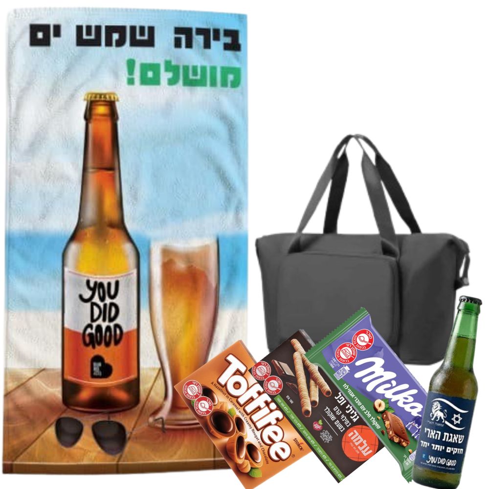 תיק נסיעות איכותי רב תאים בתוספת שוקולד מילקה, טופיפי, גלילי ופל, בירה שאגת הארי ומגבת בירה